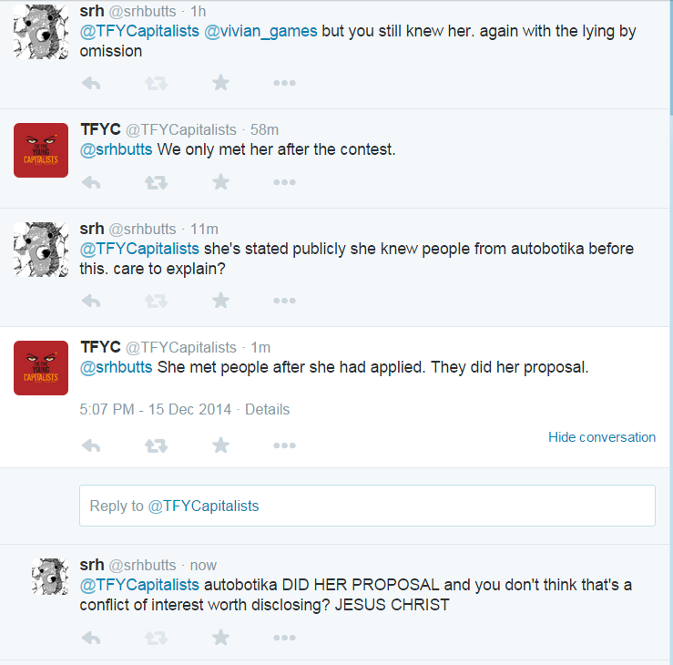 There are also various ethical failings with TFYC, such as the lack of transparency with their relationship to Autobótika, the Colombian VFX studio TFYC is contracting the game development to. The barest searching shows that TFYC is essentially just the crowdfunding front for Autobótika, as they share all the same staff, except TFYC excludes all of the male Autobótika staff from its lineup, including Autobótika's executive producer and TFYC's vocal spokesman Matthew Rappard.[38][39]